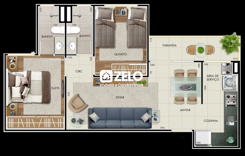 Possui dois dormitórios, sendo uma suíte, além de um banheiro social. Conta com sala de estar e jantar integradas, cozinha, área de serviço e varanda. Dispõe de dois pontos para ar-condicionado, uma vaga de garagem coberta e dois elevadores no prédio. O condomínio oferece portaria 24 horas, área gourmet, salão de festas, piscina adulto e infantil, coworking, playground, quadra poliesportiva e espaço pet.