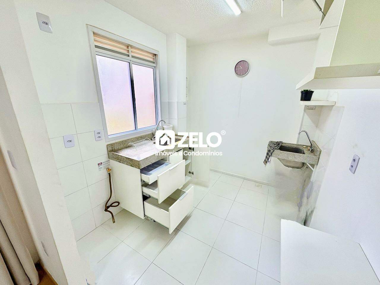 O imóvel conta com sala sem sacada, dois dormitórios sem armários, cozinha equipada com armário e uma vaga de garagem. O condomínio oferece portaria 24 horas, churrasqueira, playground, salão de festas e salão de jogos.