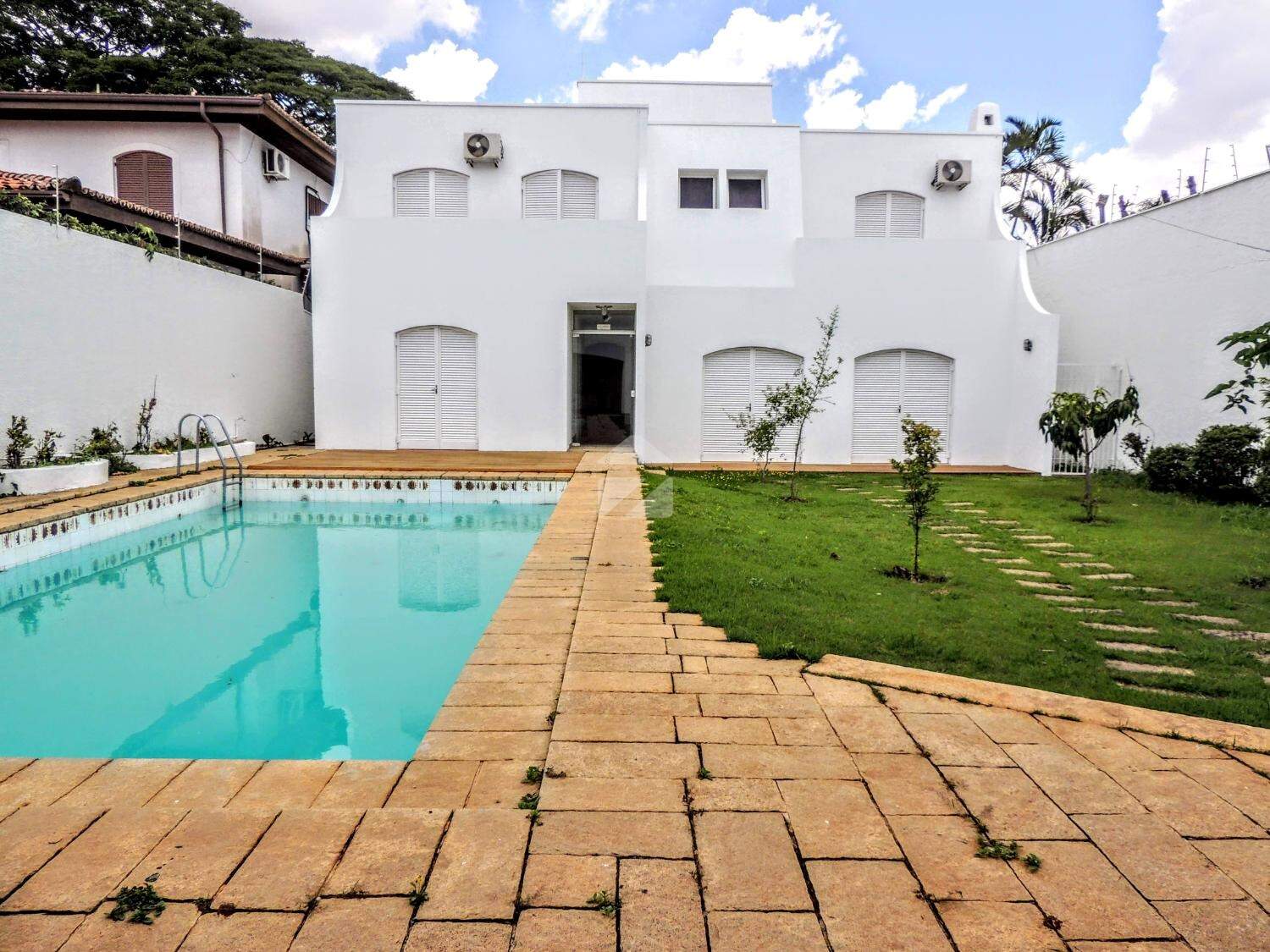 Imóvel resedencial/comercial possui dez salas, dois dormitórios, cinco banheiros, ar-condicionado, quintal com piscina e seis vagas de garagem, oferecendo excelente estrutura para clínicas, escritórios, consultórios ou também para uso residencial. Aceita pets.